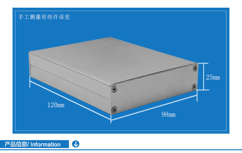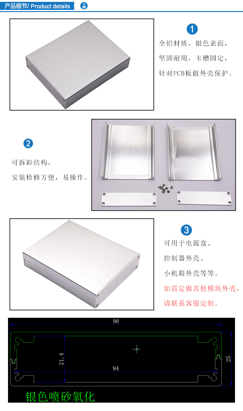 特点:1.全铝材质,银色表面,坚固耐用,卡槽固定,针对PCB板做外壳保护。