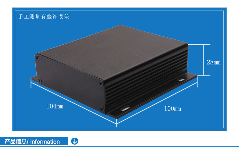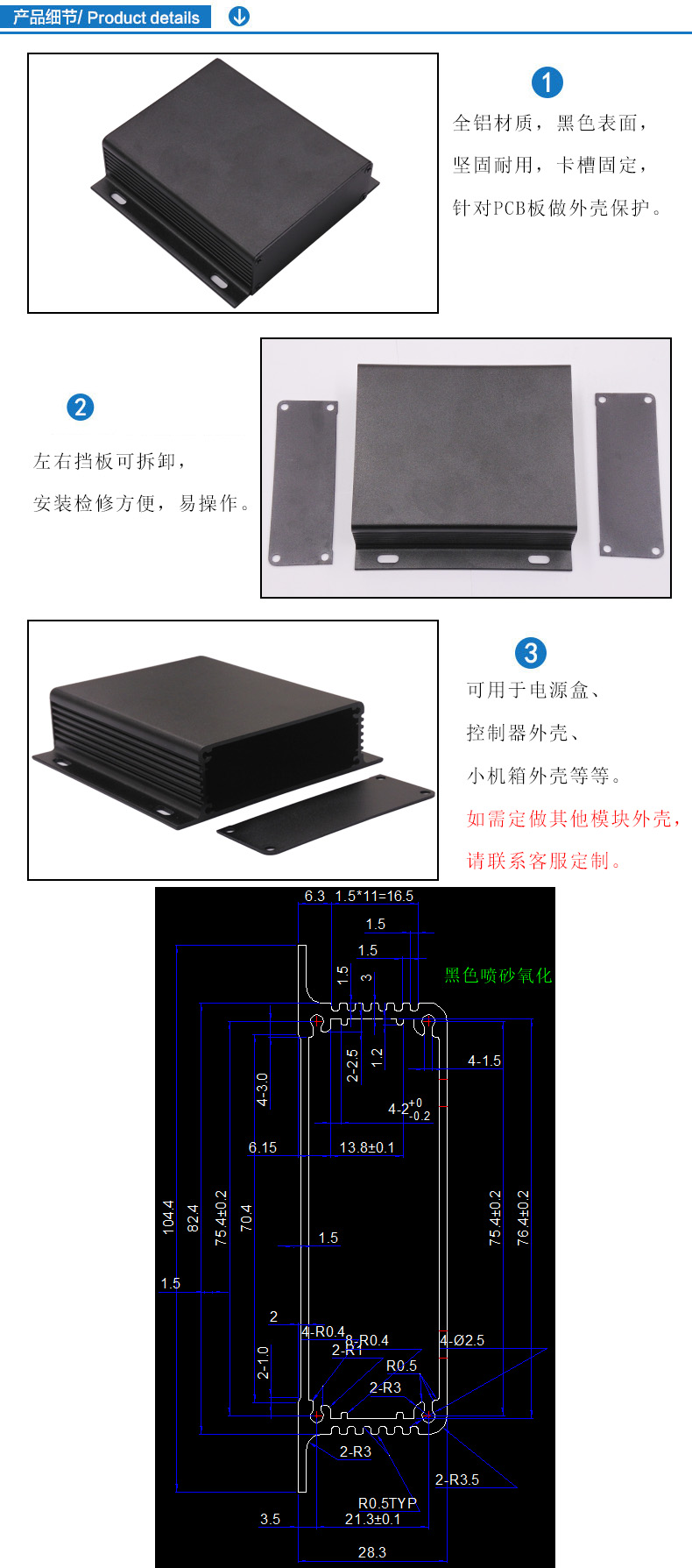 特点:1.全铝材质,黑色表面,坚固耐用,卡槽固定,针对PCB板做外壳保护。