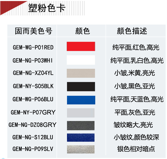 七、外壳表面颜色,以下是我们备有库存的喷粉颜色,请选择【GEM-NY-S05BLK】,如果要其他指定颜色,请注明劳尔色号或者潘通色号__________,需要延长周期和成本。