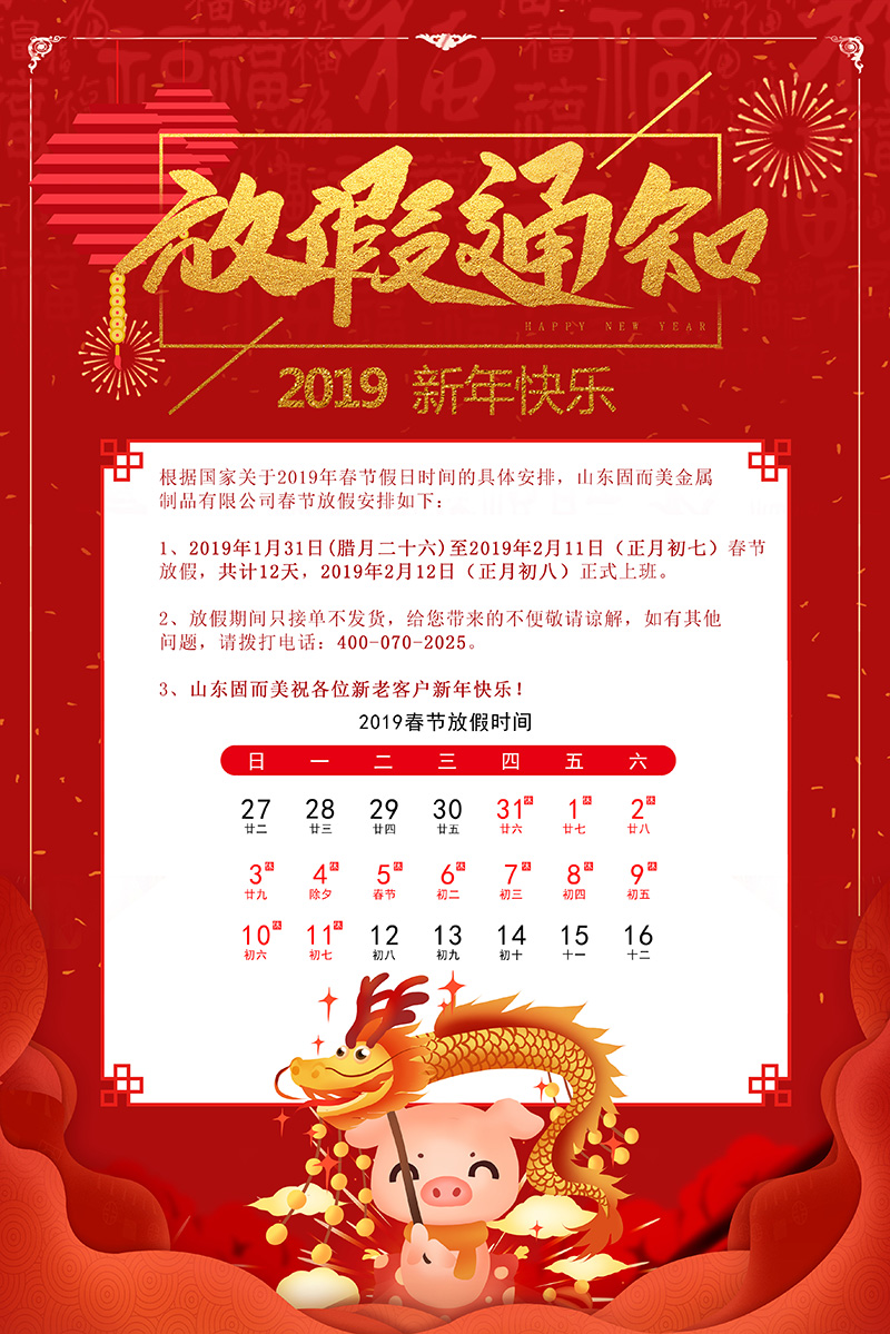 根据国家关于2019年春节假日时间的具体安排,山东固而美金属制品有限公司春节放假安排如下:
