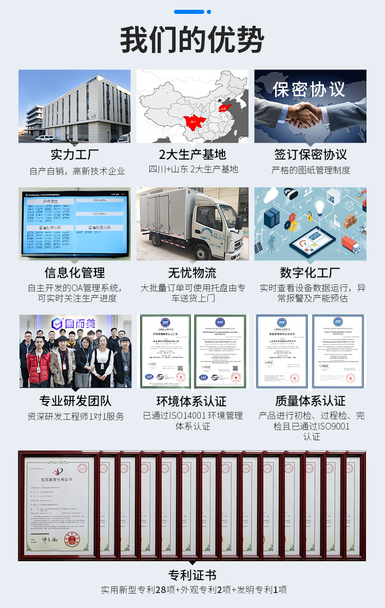 公司有专业的设计团队,获得国家专利共31项,实用新型专利28项,外观专利2项,发明专利1项,产品均通过ISO9001质量体系认证和ISO14001环境管理体系认证,有成熟完善的生产线,作为专业的钣金加工厂,企业有三万件产品的研发经验。厂家有专业技术工人,含过程检和完检两道质检工序,欢迎各位厂家、客户来图或来样定制产品。